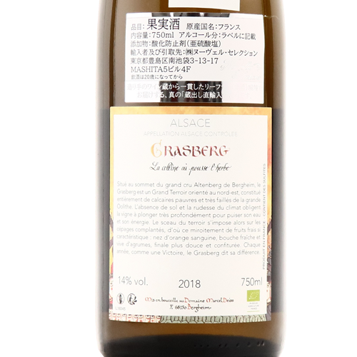 グラン・クリュ「アルテンベルグ・ド・ベルグハイム」の丘の北東斜面、標高340メートルに位置する石灰岩土壌の、リースリング、ピノ・グリ、ゲヴュルツトラミネールが植わっている畑のブドウを混醸しています。平均樹齢40年のVV。
